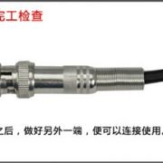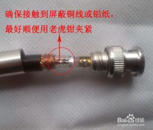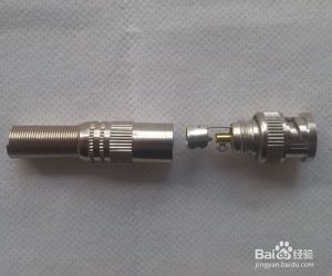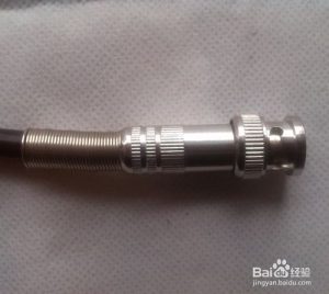 3、装配BNC 接头:连接好芯线后,先将屏蔽金属套筒套入同轴电缆,再将芯线插针从BNC 接头本体尾部孔中向前插入,使芯线插针从前端向外仲出,最后将金属套简前推,使套简将外层金属屏蔽线卡在BNC 接头本体尾部的圆柱体;