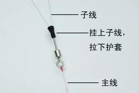 快速子线夹,和开口八字环类似的效果,省掉了O型圈,在钓体形不太大的鱼的时候,非常方便,子线事先打好结,更换的时候,挂进弯钩里面再把橡胶护套拉下来,如下图