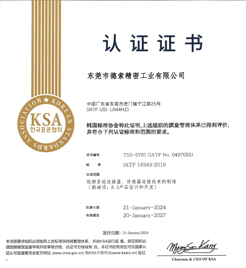 ??东莞市德索精密工业有限公司(以下简称“德索精密”)拥有?KSA(韩国标准协会) 审核颁发的 IATF 16949:2016 质量管理体系认证。德索精密在视频系统连接器传感器连接线束的制造领域,已经完全具备了为全球汽车产业链提供高标准、高可靠性产品的硬核实力!