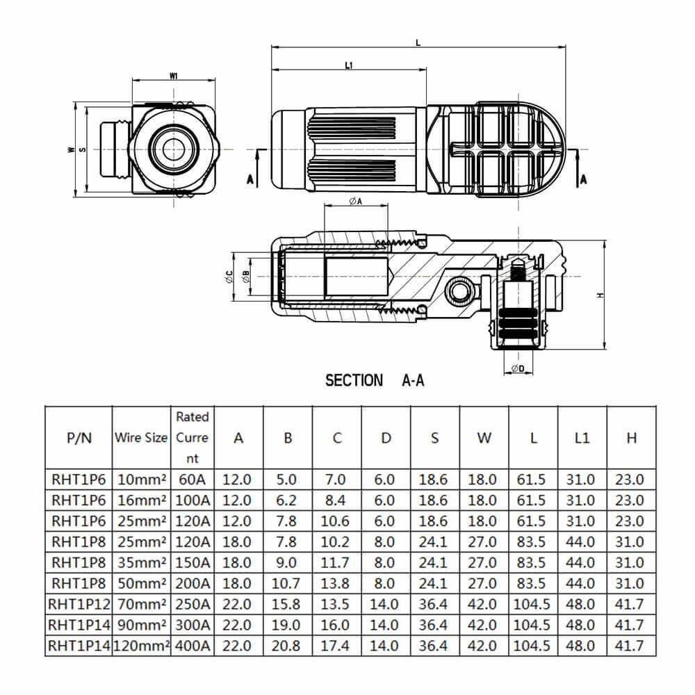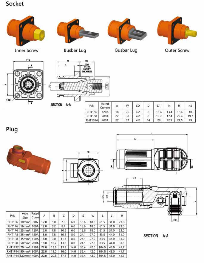 标签:储能连接器,弯式,插头和插座,6mm,红色,IP65,100A,带孔铜牌