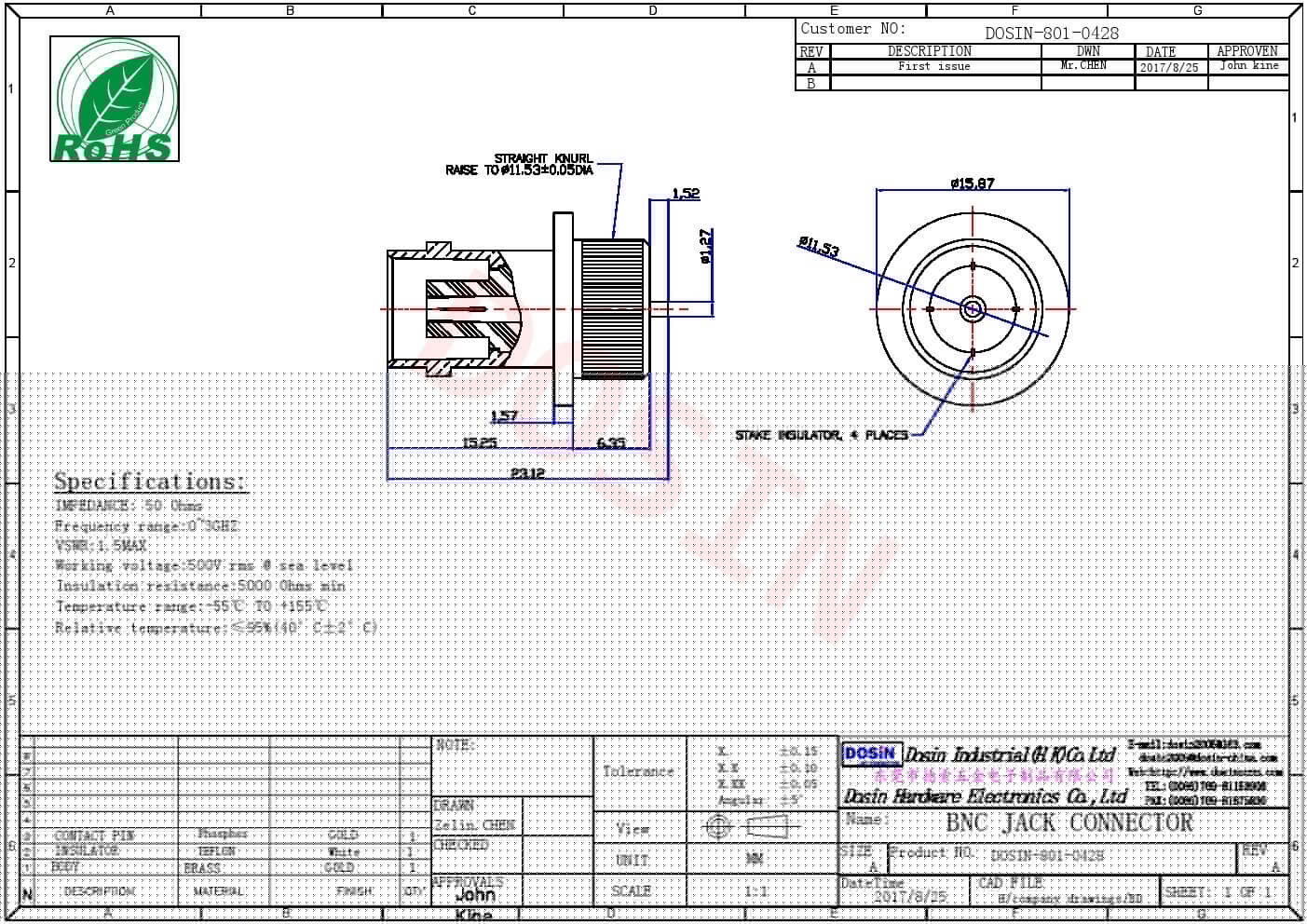 | 中心接触电阻 | ≦ 1.5 mΩ (Milliohms max.) |
